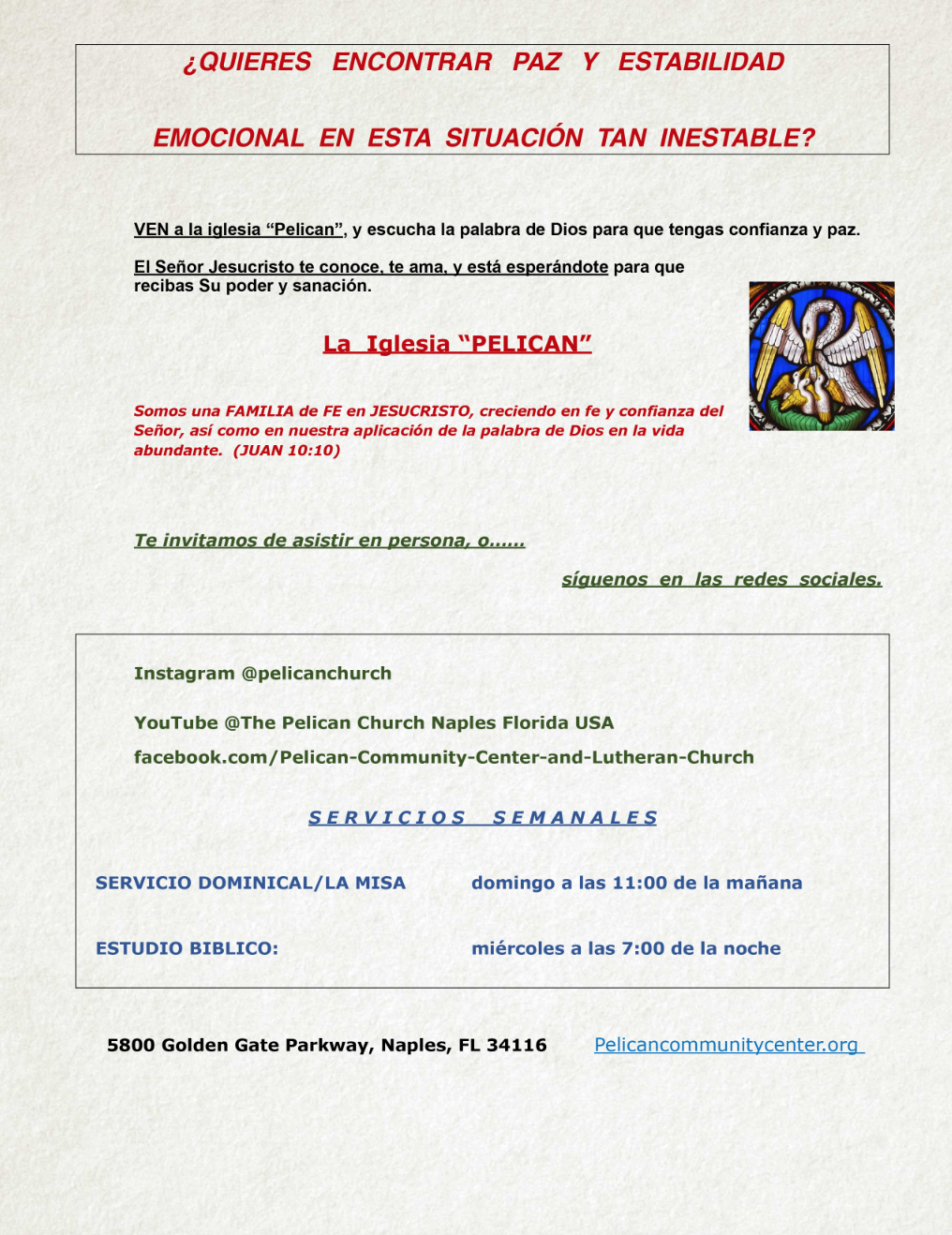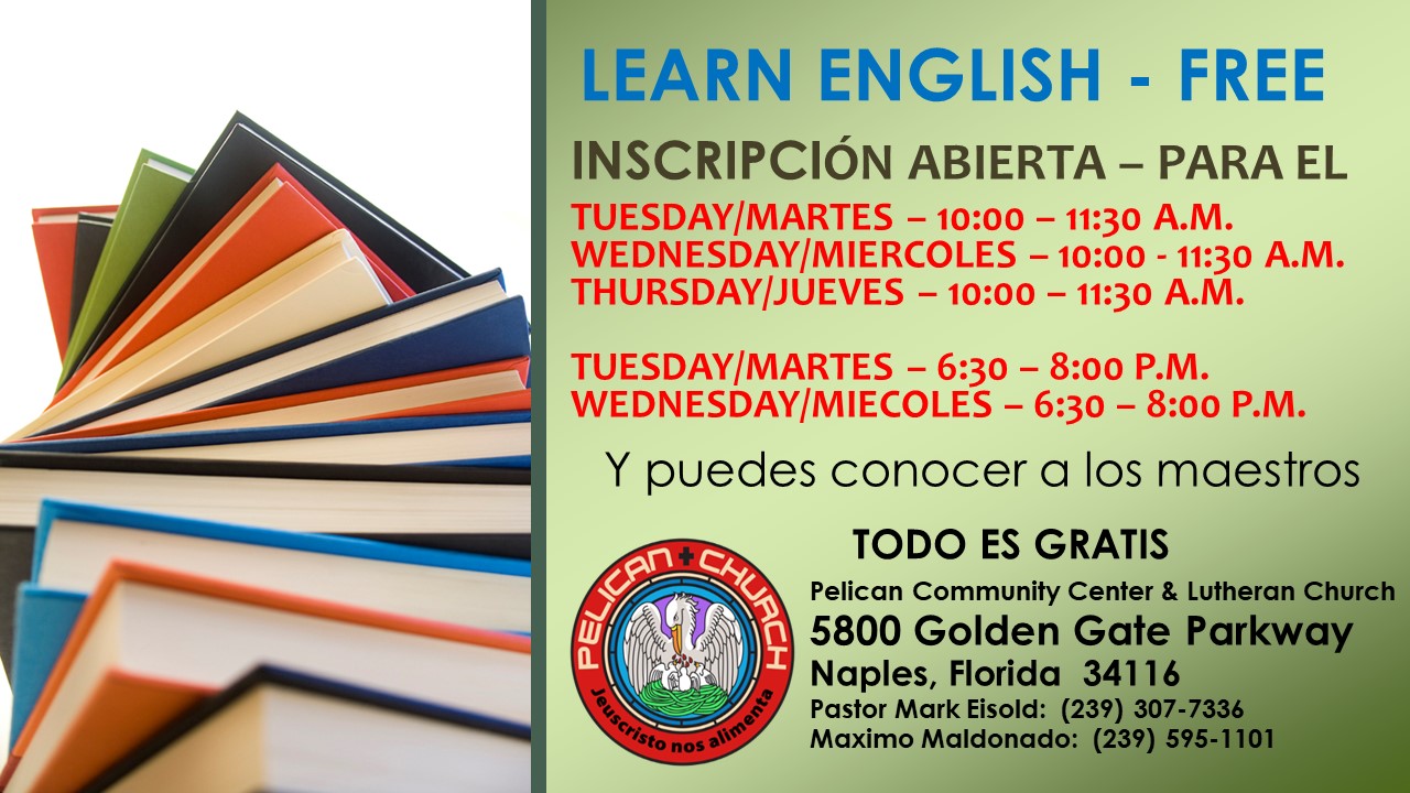 The mission of the Pelican Community Center is to support all families through their daily struggles in life, what they need most for the happiest and healthiest families, and to become productive members of society. Our center provides ESL classes in English in the morning and evening. We are dedicated to serve the multi-cultural and multi-ethnic communities within Collier County. The Pelican Community Center and Lutheran Church is a mission church, and our work is reviewed and supervised by Grace Lutheran Church of Naples.